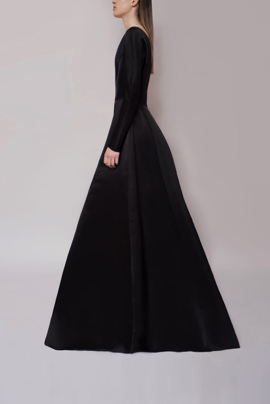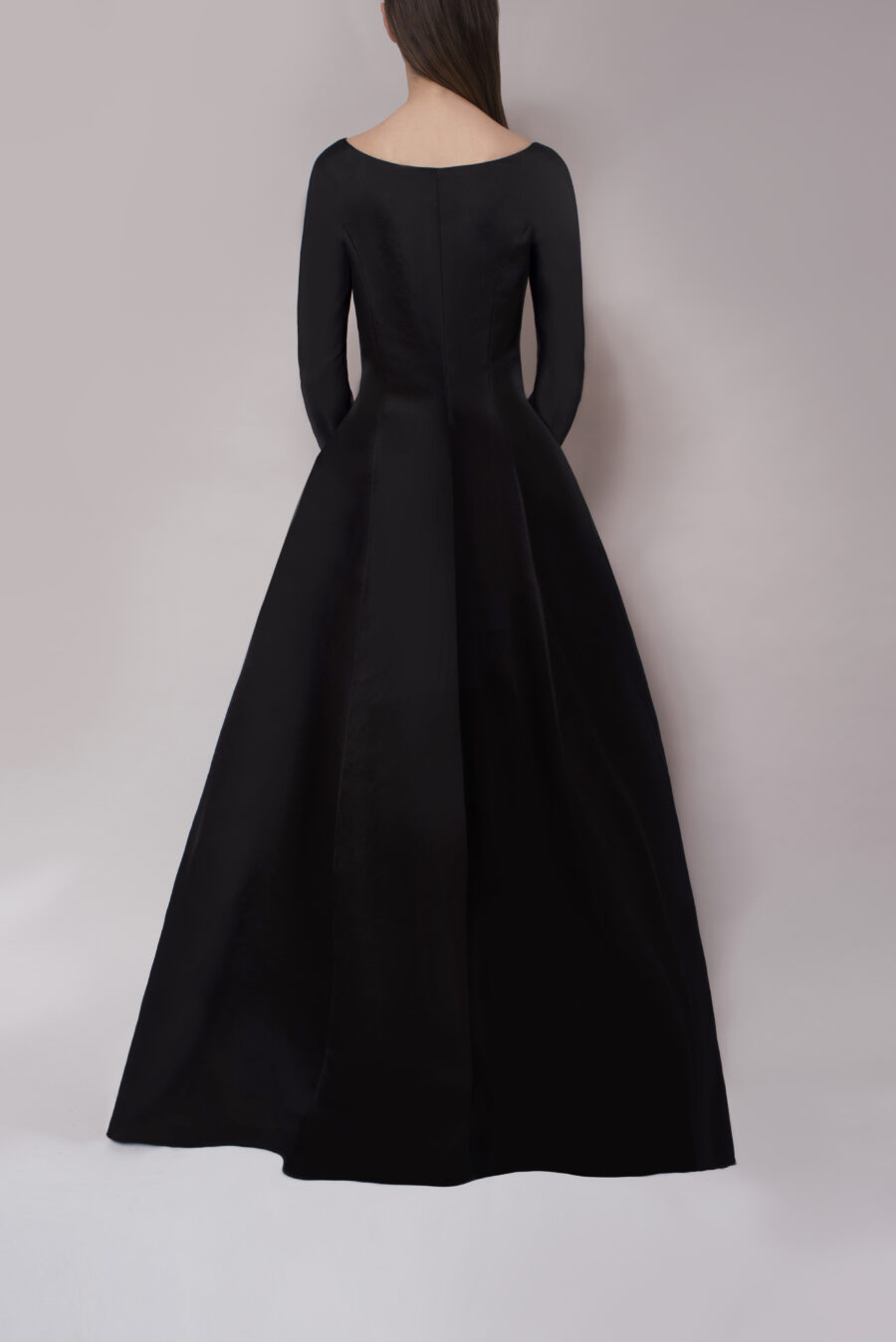 - An ode to classic couture, our Black Dahlia Gown features hidden buttoning along the front, a bateau neckline and a gored skirt. Model comes with long sleeves, cinched waist and floor length cut. - Composition: