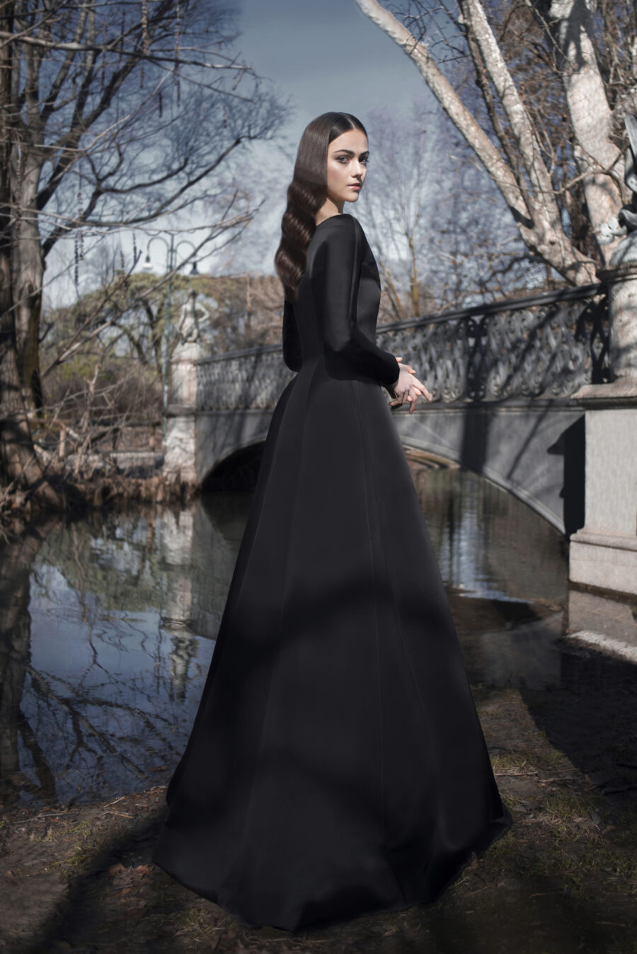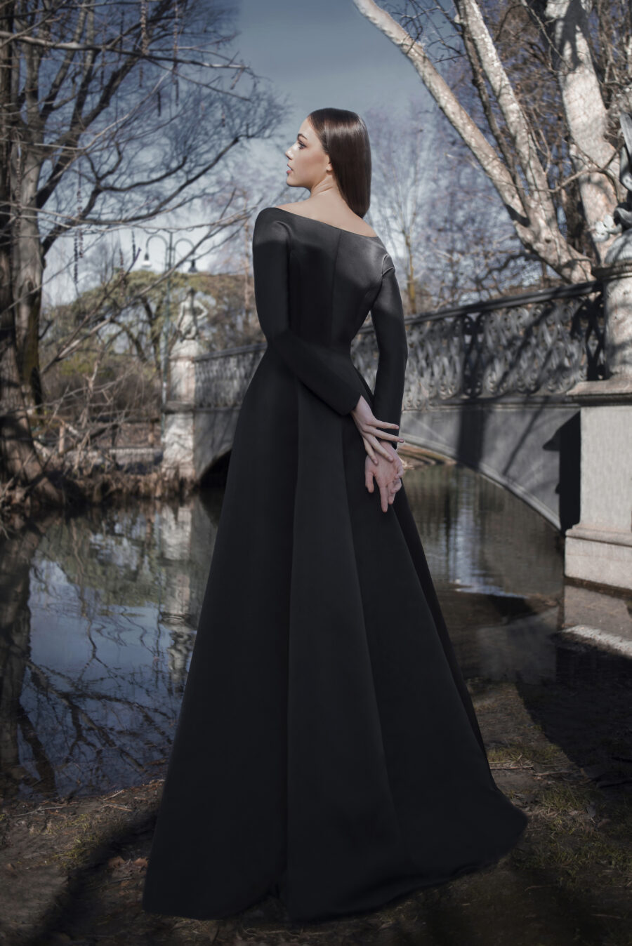 An ode to classic couture, our Black Dahlia Gown features hidden buttoning along the front, a bateau neckline and a gored skirt. Model comes with long sleeves, cinched waist and floor length cut.