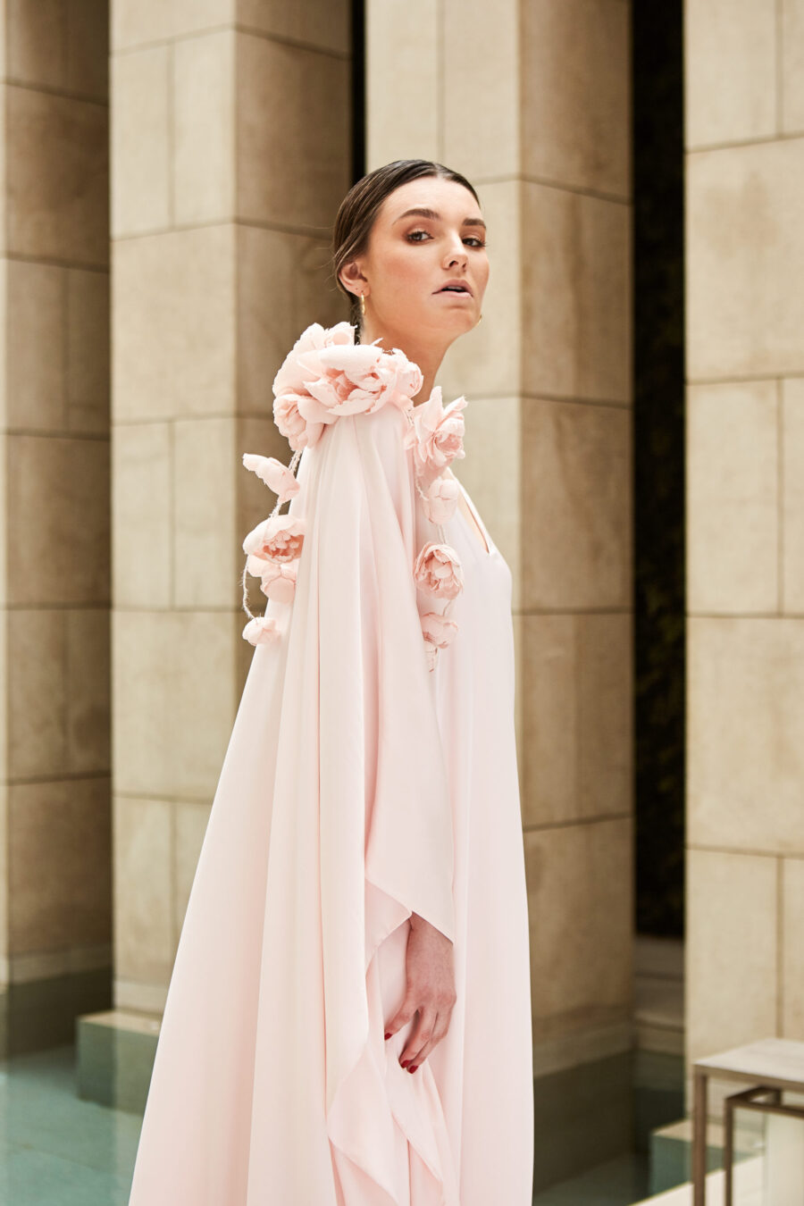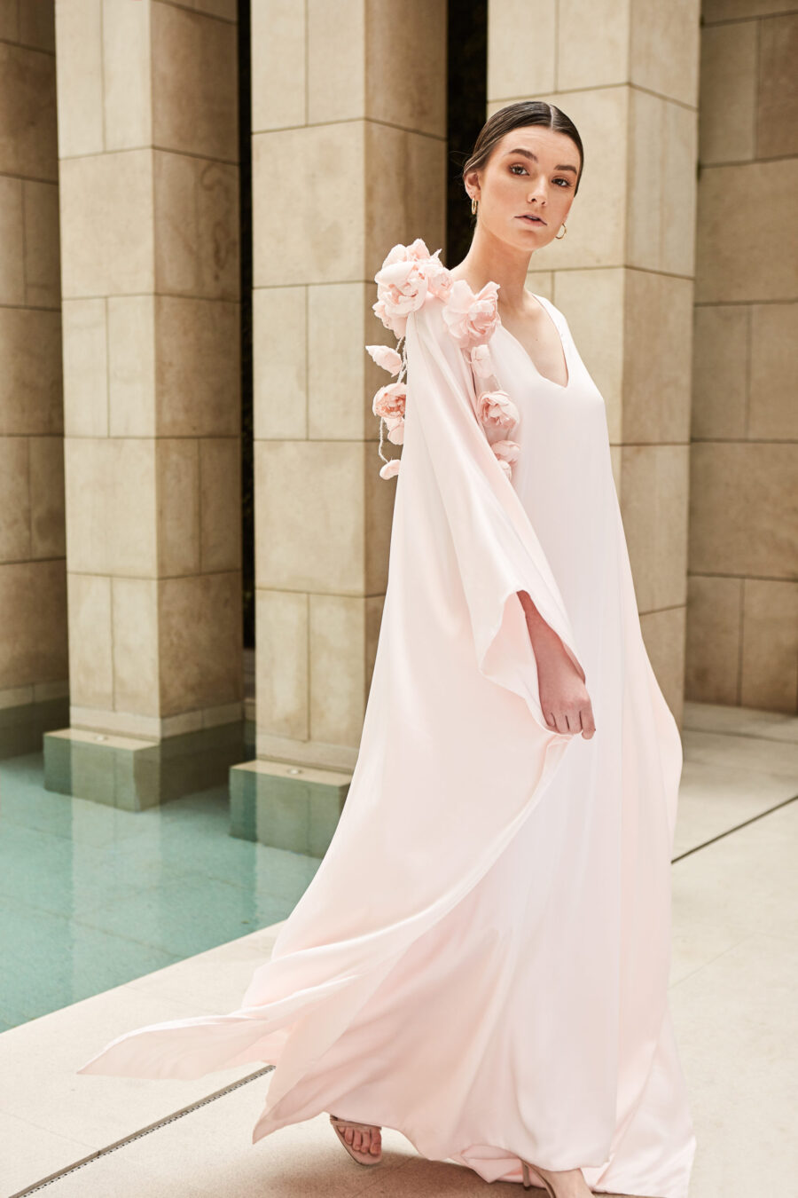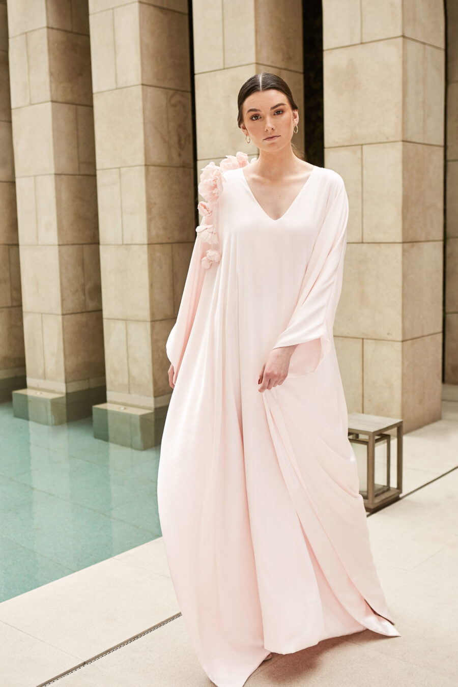 Inspire and enamour with our Peony Bouquet Caftan. Features a peony cascade on the shoulder, v-neck and floor length cut.
